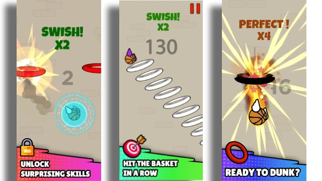 Players tap to make the ball jump and navigate through hoops. The objective is to pass through as many hoops as possible without missing. Players can also collect different skins for the ball and tackle various challenges to keep the game exciting.