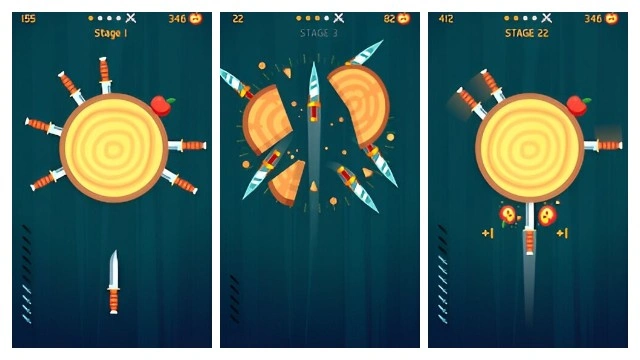 Throw the knives into the logs to break them. Slash the apples and unlock new knives. Each 5th stage is defended by a boss - beat them to get exclusive knives!